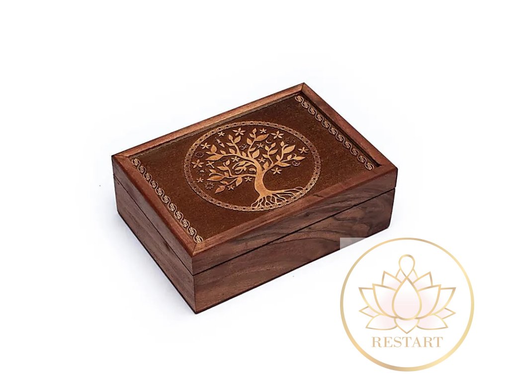Víko šperkovnice zdobí reliéf Stromu života, drobné symboly a ornamenty. Dřevěná šperkovnice je uvnitř potažena černou látkou, která ochrání uložené věci.