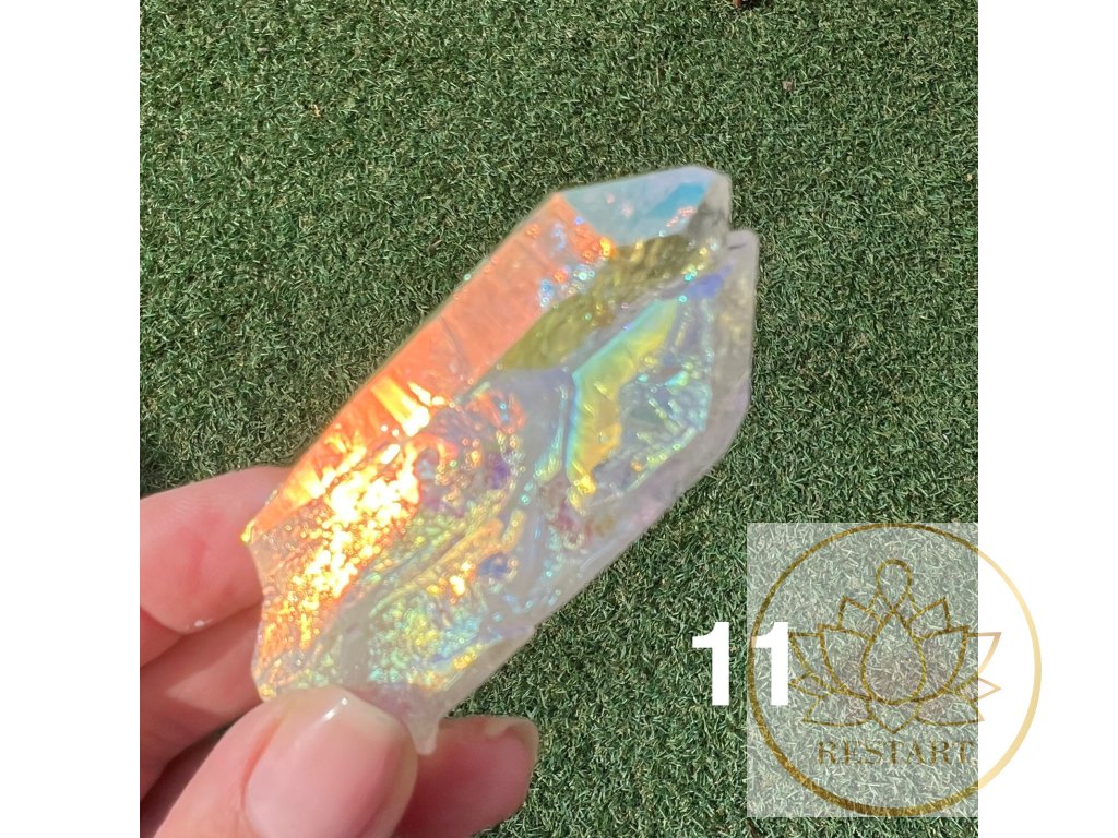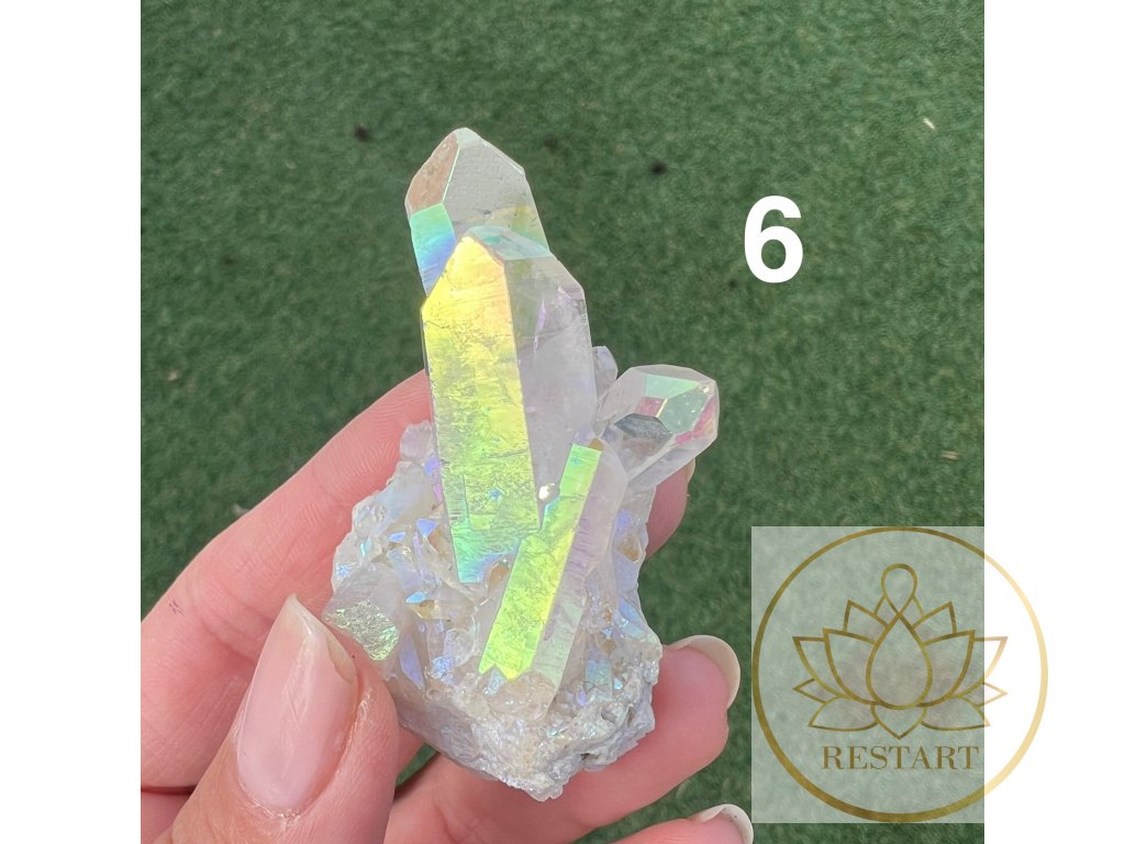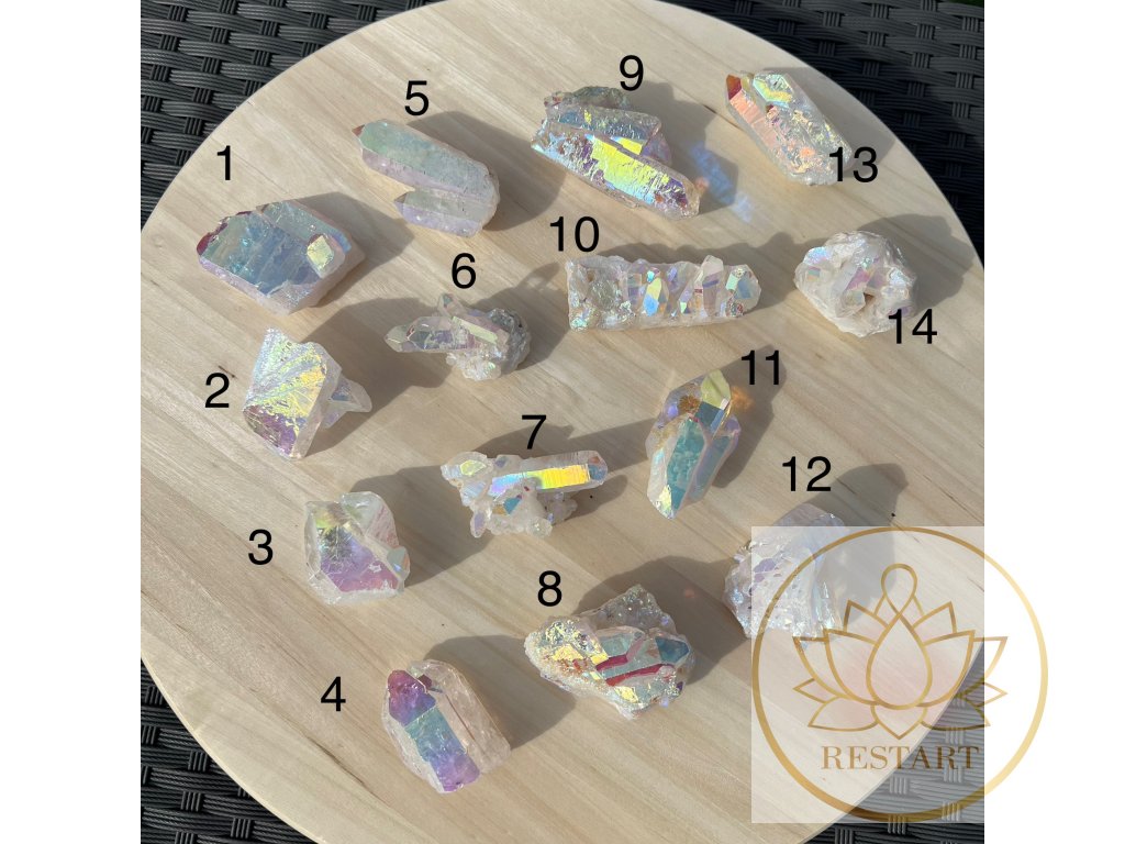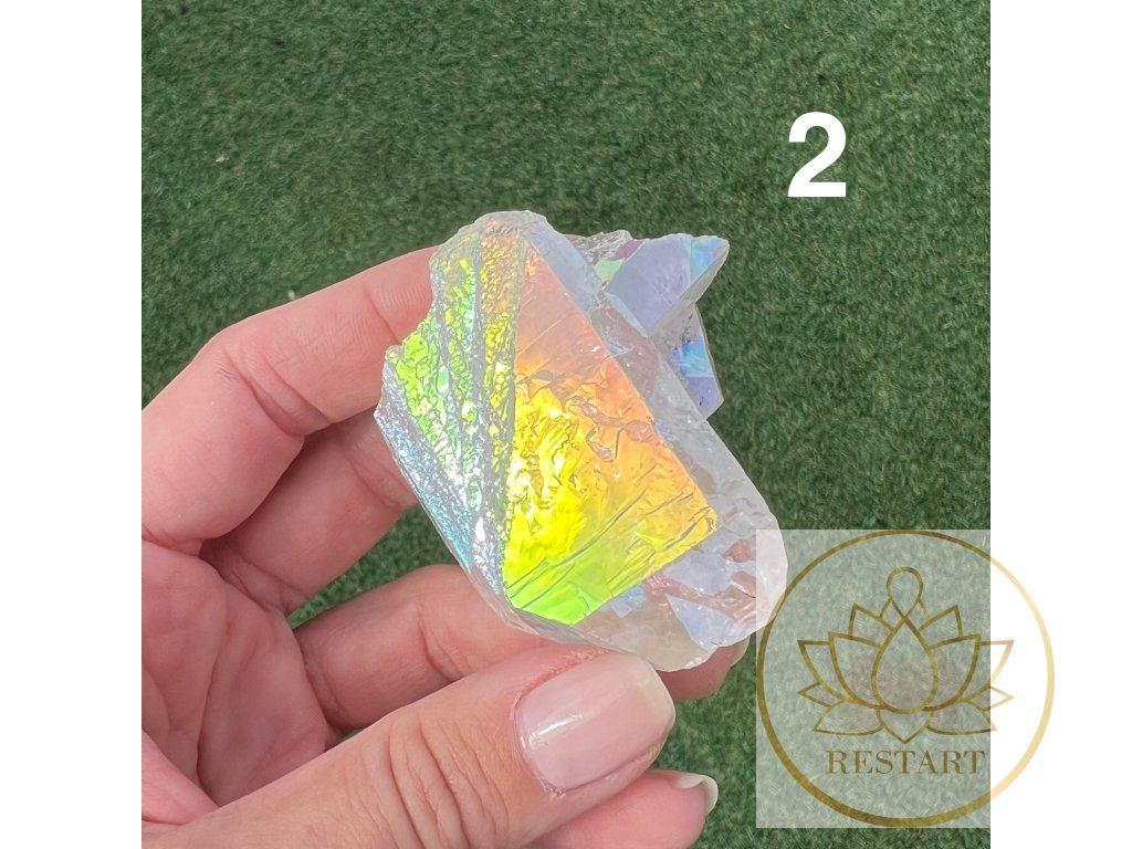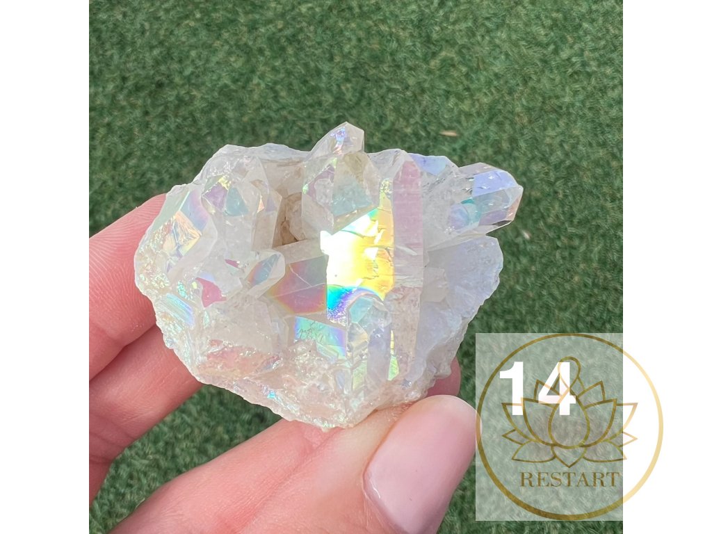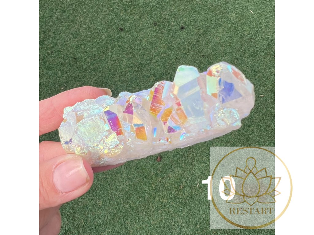 Každá drúza Andělské aury je jedinečným spojením čisté síly křišťálu a duhového světla, které vzniká pokovením přírodního křišťálu s ušlechtilými kovy (platinou, stříbrem či titanem). Tento proces vytváří jemnou záři duhových odstínů – připomínku nebeské přítomnosti a andělské ochrany.