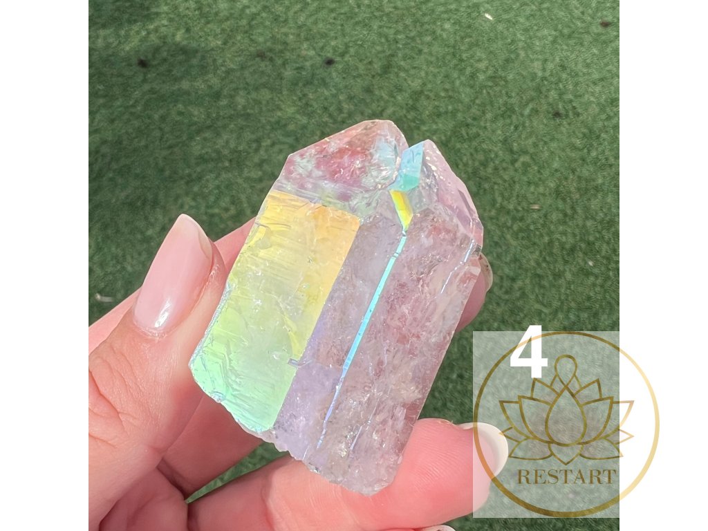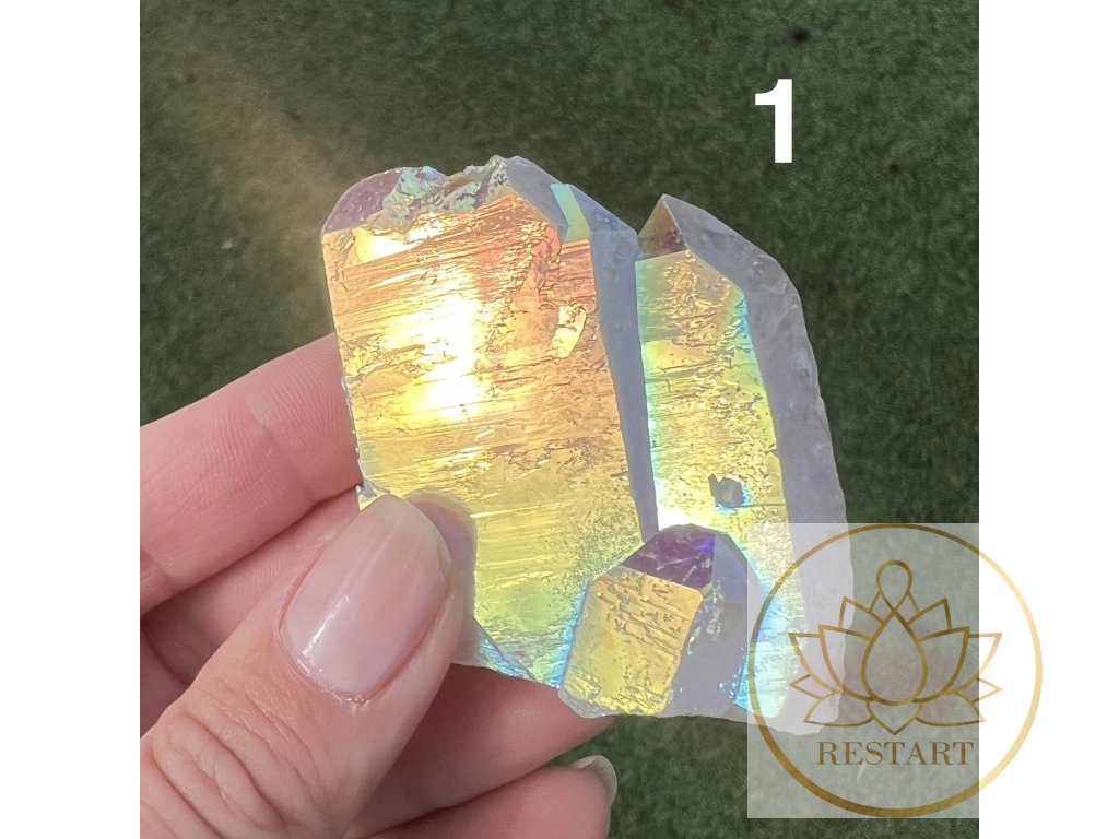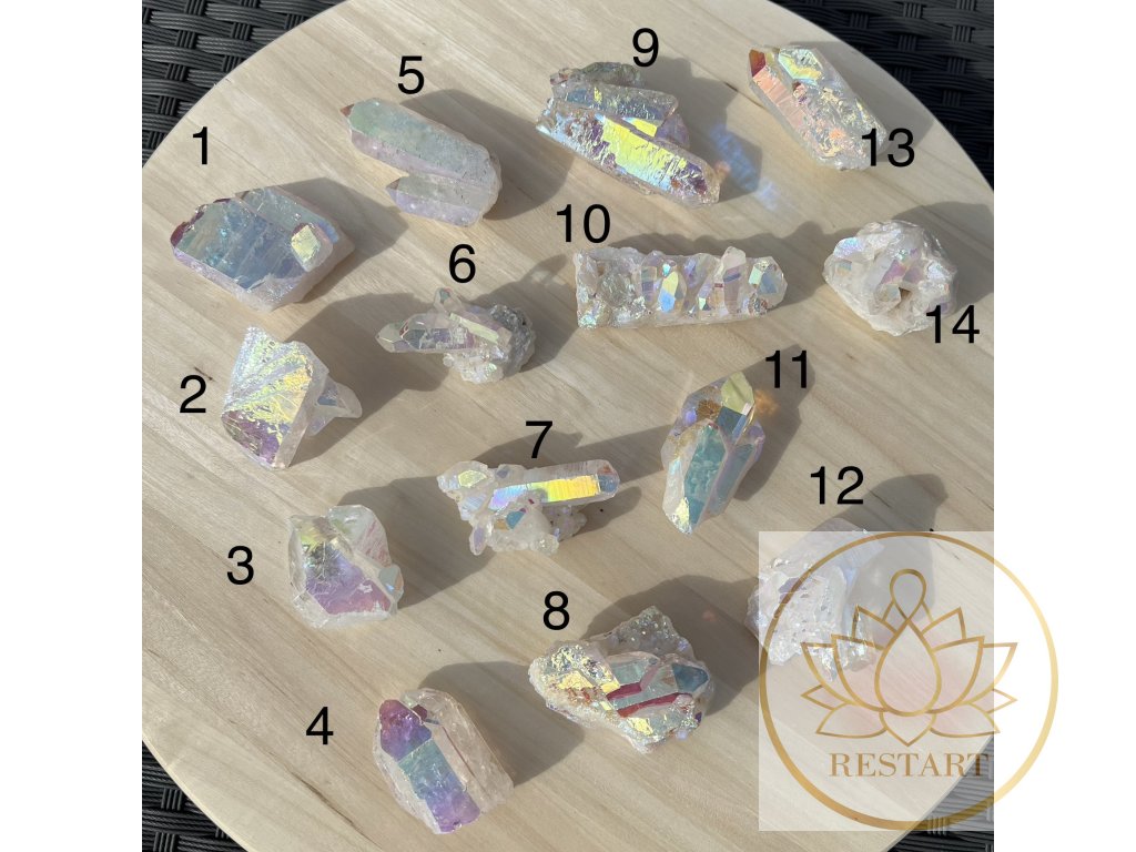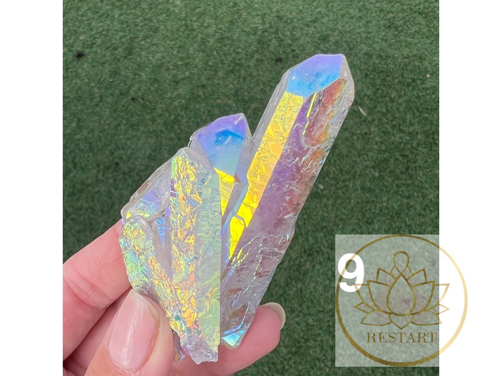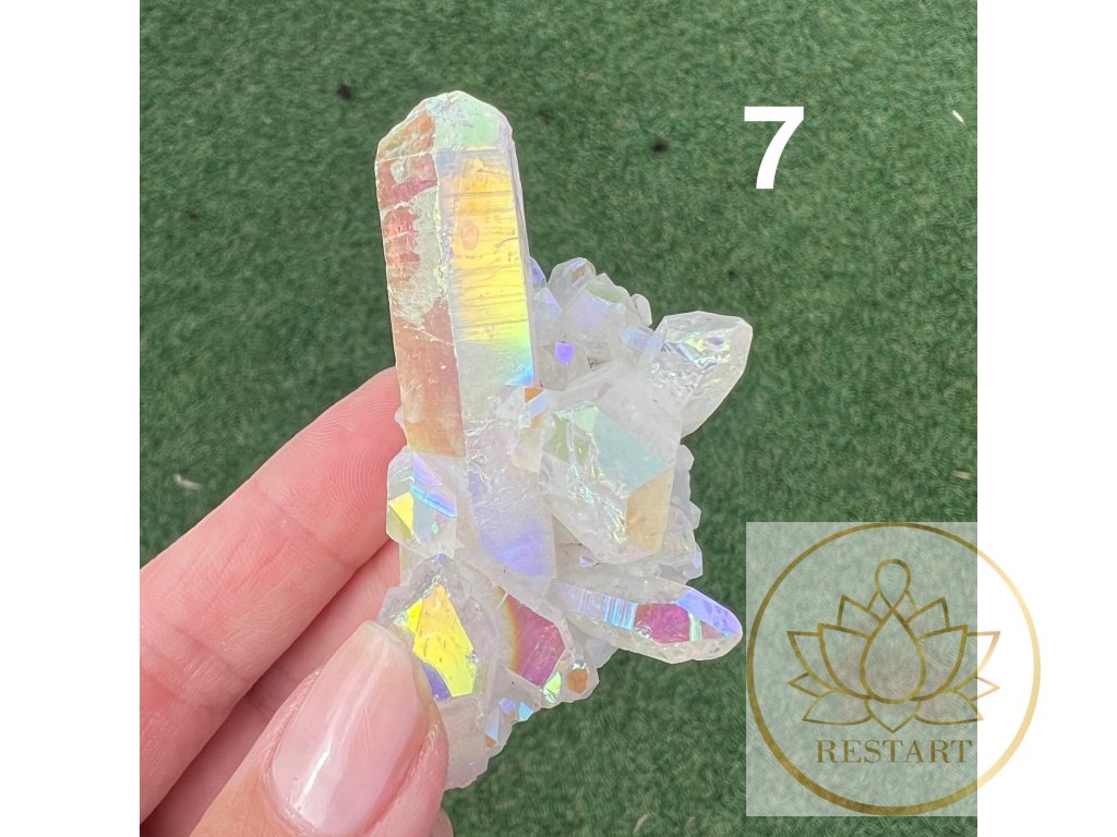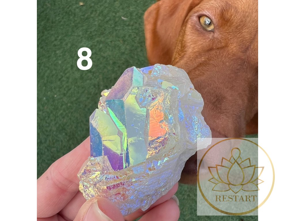 Každá drúza Andělské aury je jedinečným spojením čisté síly křišťálu a duhového světla, které vzniká pokovením přírodního křišťálu s ušlechtilými kovy (platinou, stříbrem či titanem). Tento proces vytváří jemnou záři duhových odstínů – připomínku nebeské přítomnosti a andělské ochrany.