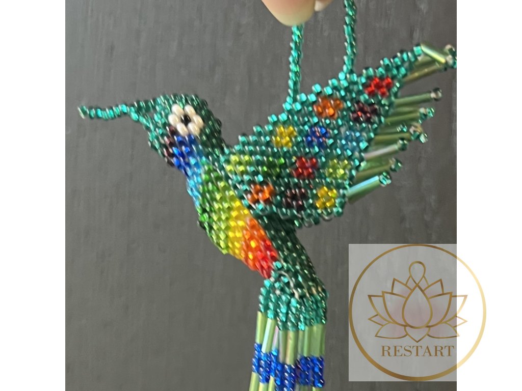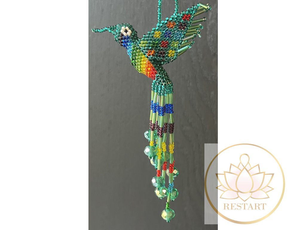 Kolibřík ze zářivých korálků, ruční práce, vyroben v Guatemale.