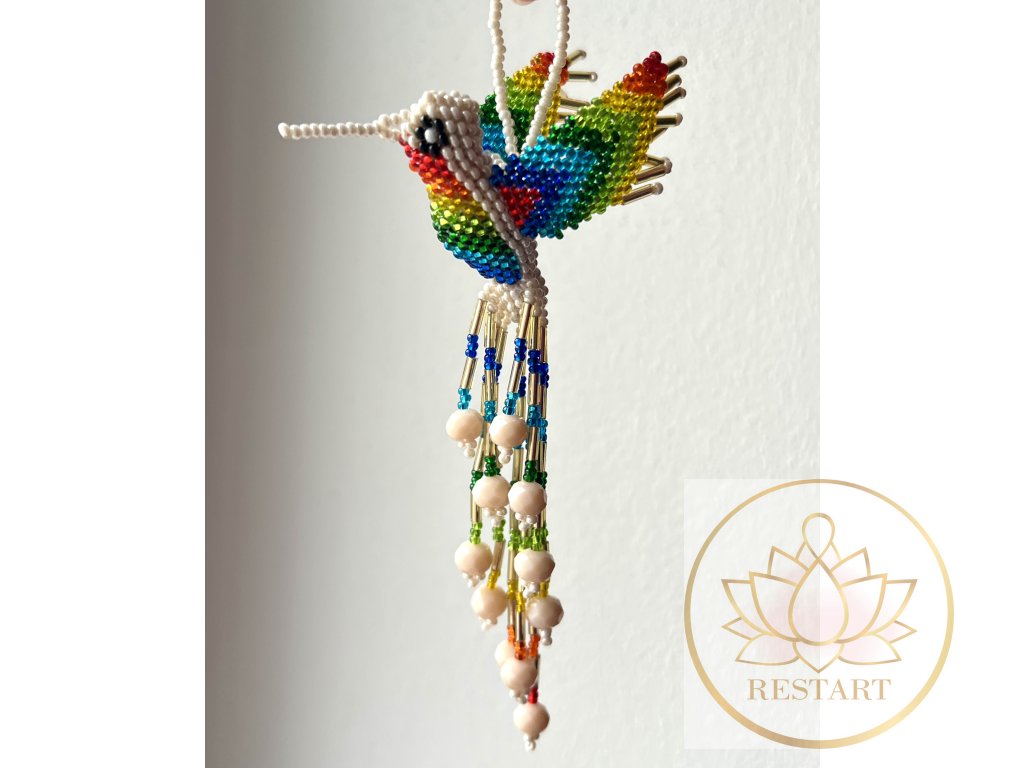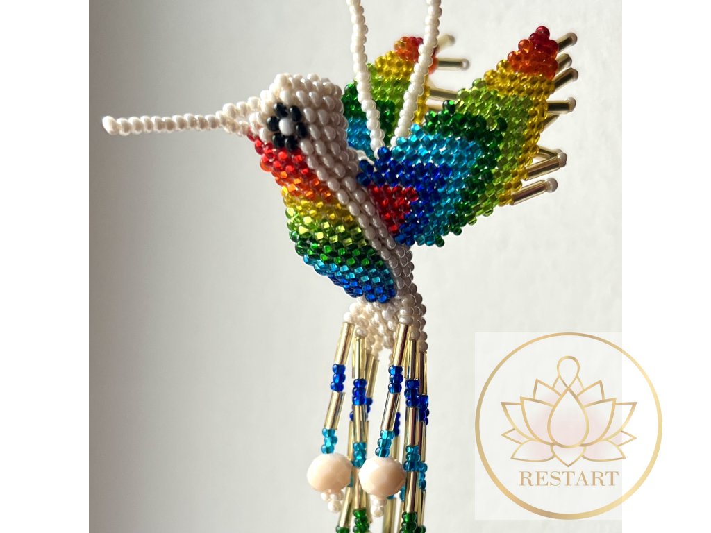 Kolibřík ze zářivých korálků, ruční práce, vyroben v Guatemale.
