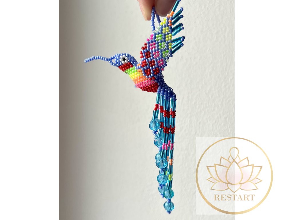 Kolibřík ze zářivých korálků, ruční práce, vyroben v Guatemale.