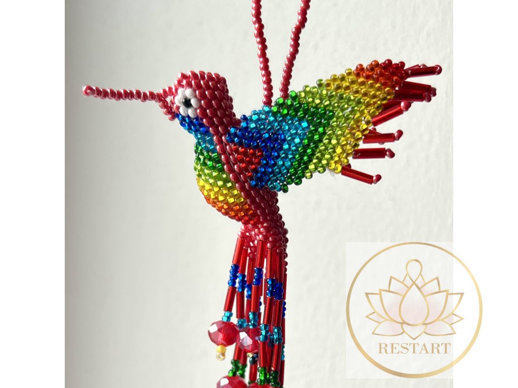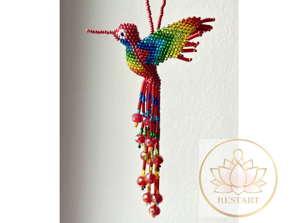 Kolibřík ze zářivých korálků, ruční práce, vyroben v Guatemale.