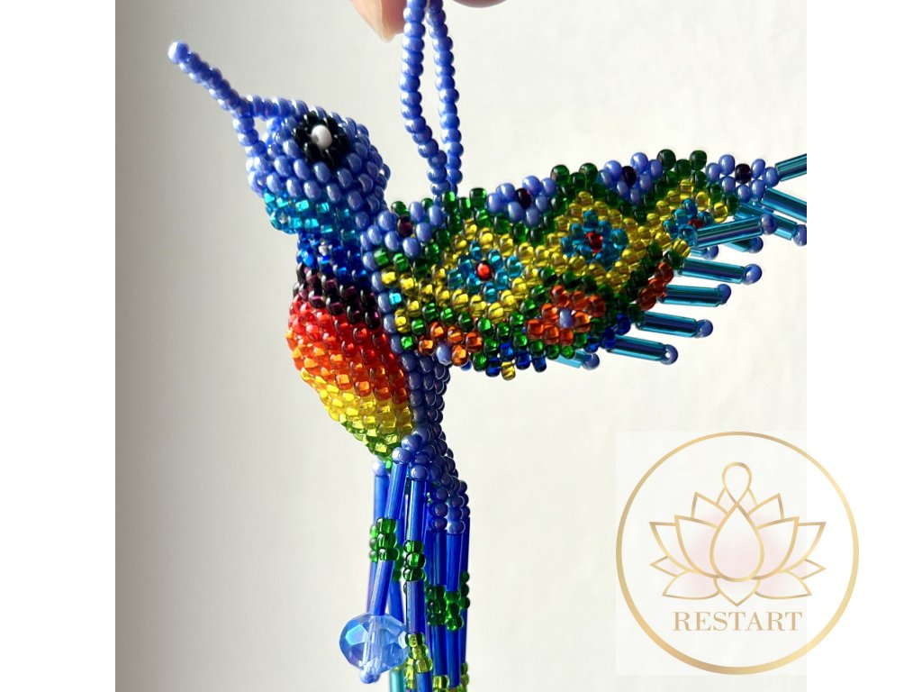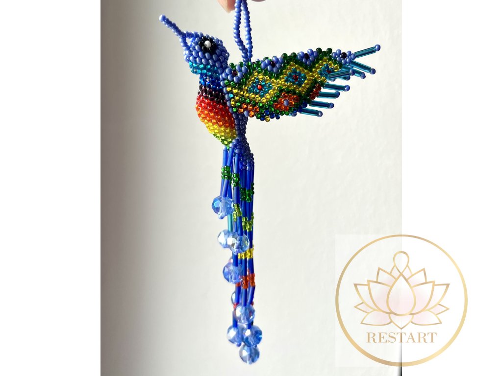 Kolibřík ze zářivých korálků, ruční práce, vyroben v Guatemale.