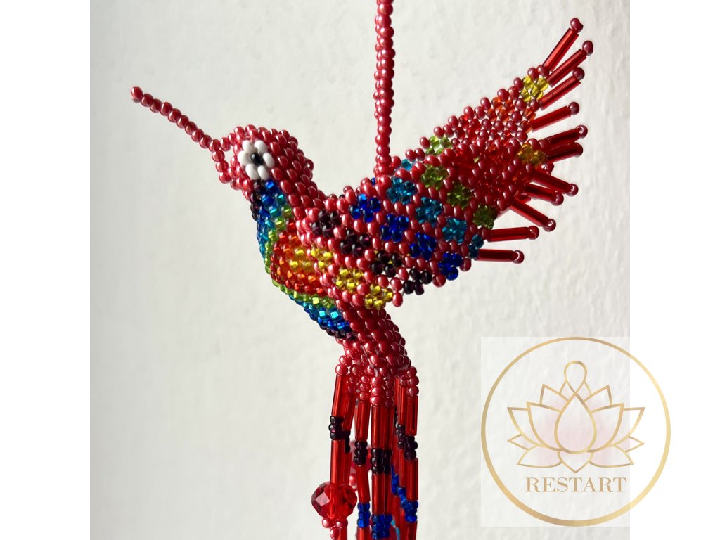 Kolibřík ze zářivých korálků, ruční práce, vyroben v Guatemale.