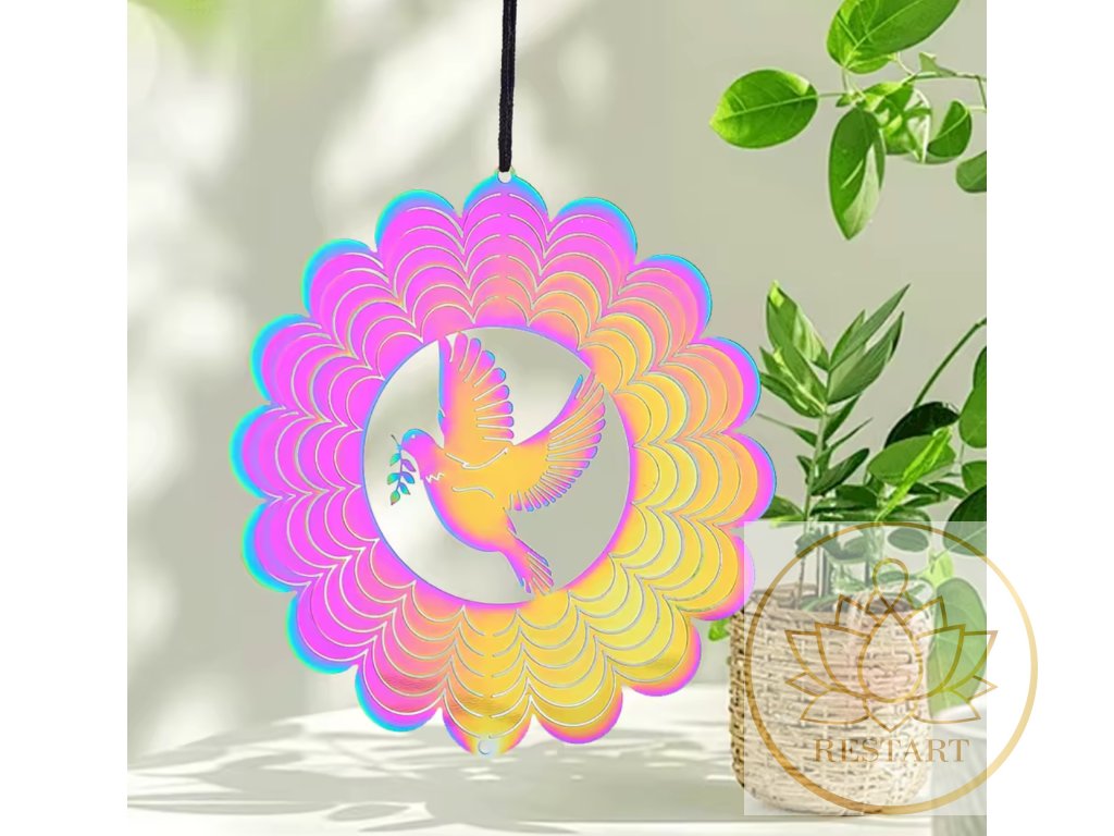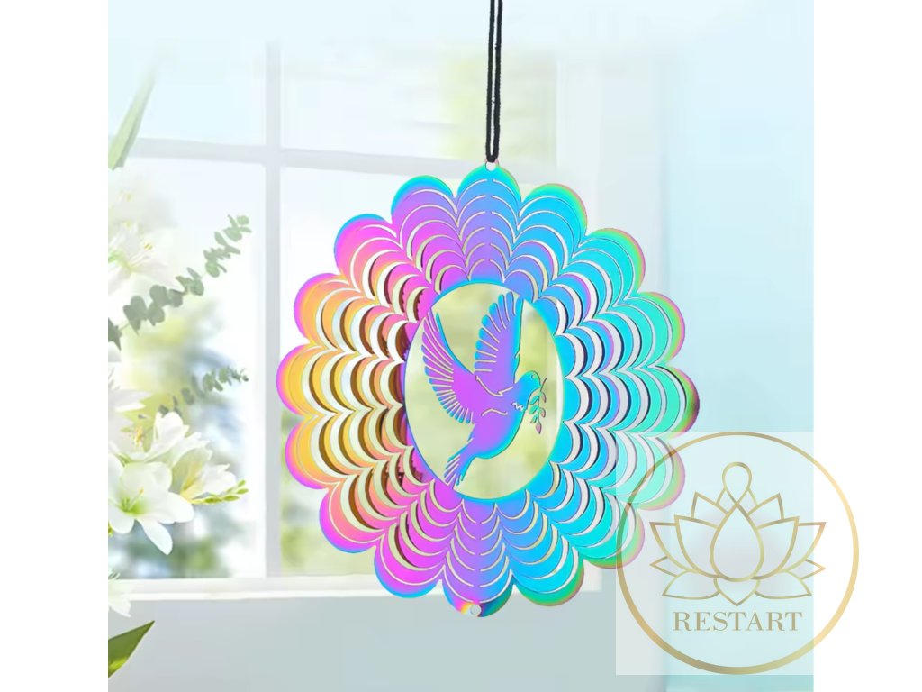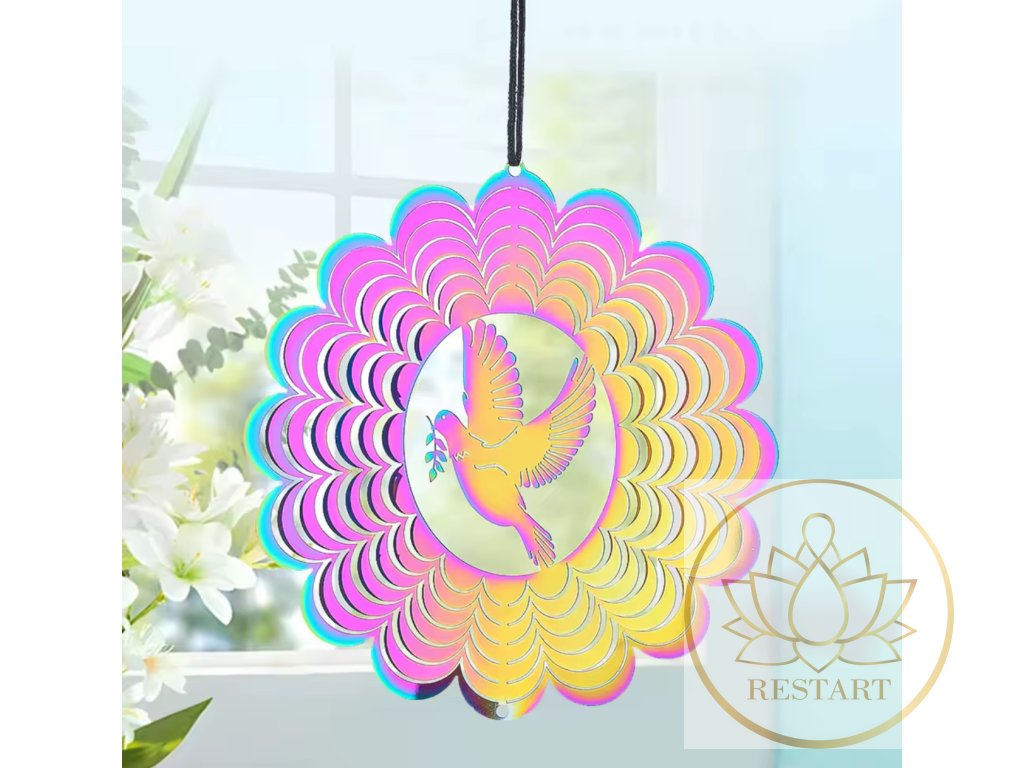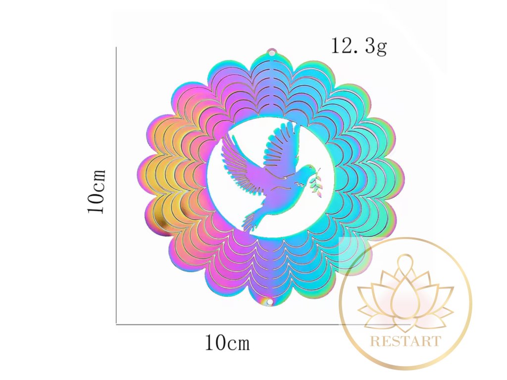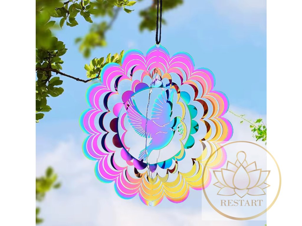 Kovový závěs se za pomocí větru ve vzduchu točí a rotuje. Tím účinně aktivuje energii a oživuje okolní prostor.