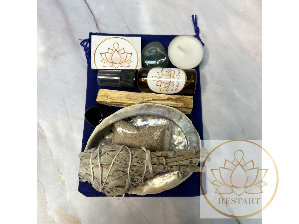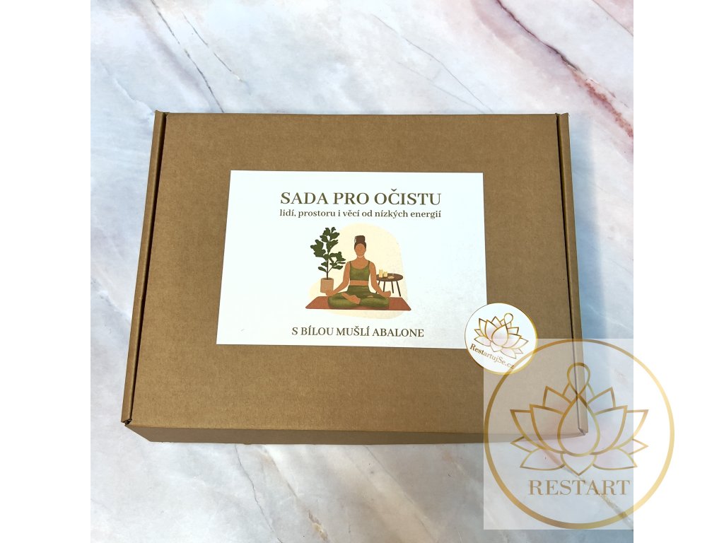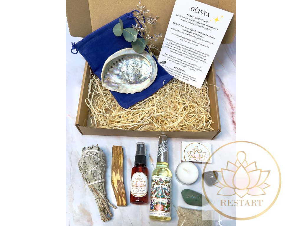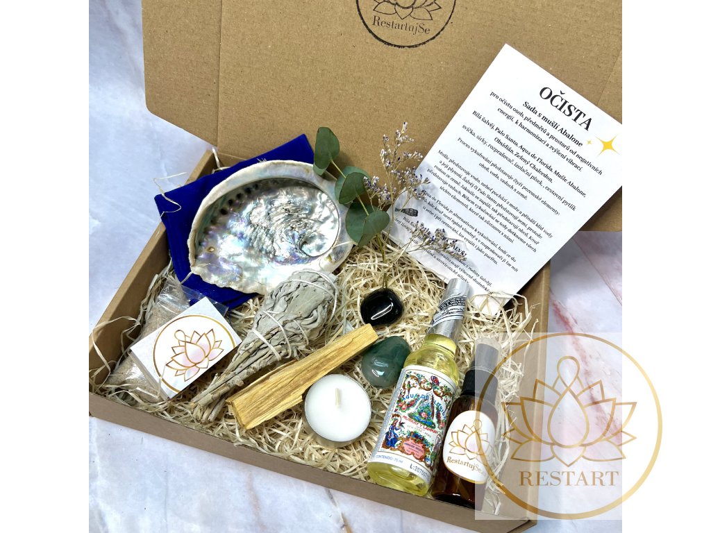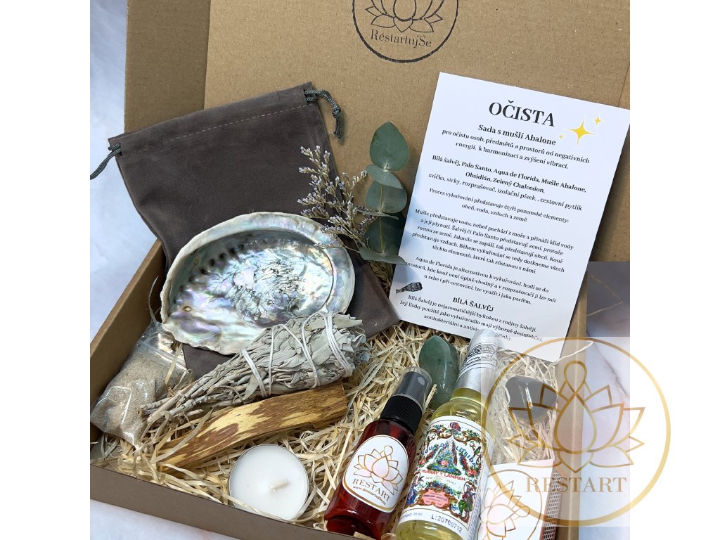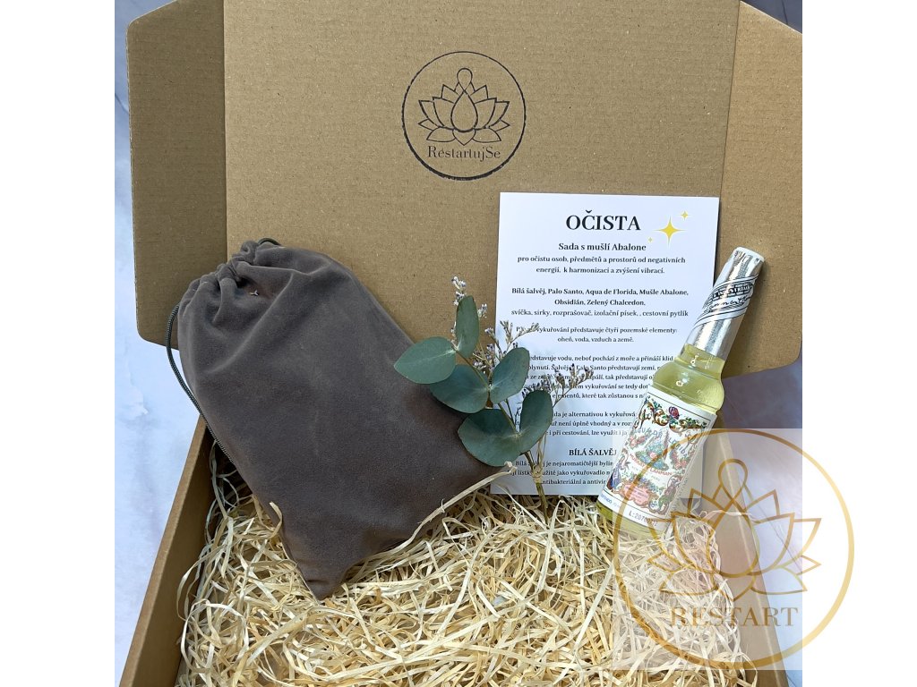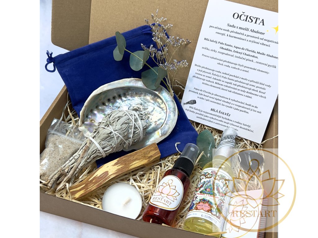 Sada obsahuje: Brožurka, mušle Abalone, Bílá šalvěj, Palo Santo, Aqua de Florida, Obsidián, Zelený Chalcedon, svíčka, sametový pytlík, sirky, rozprašovač, izolační písek do mušle