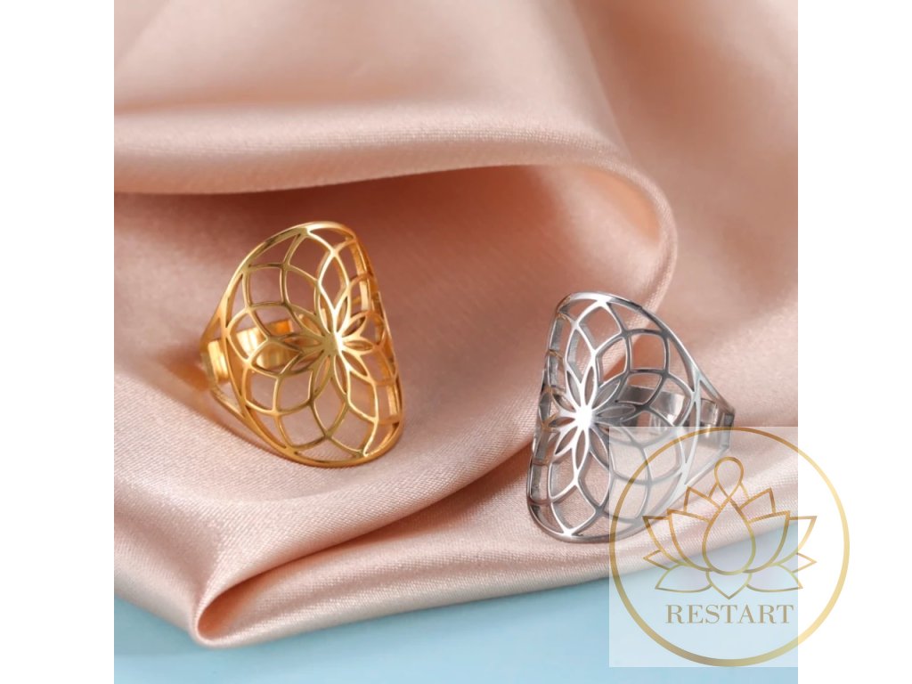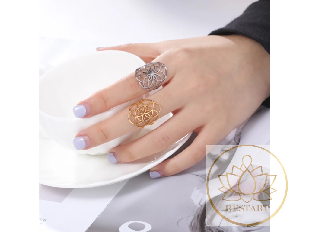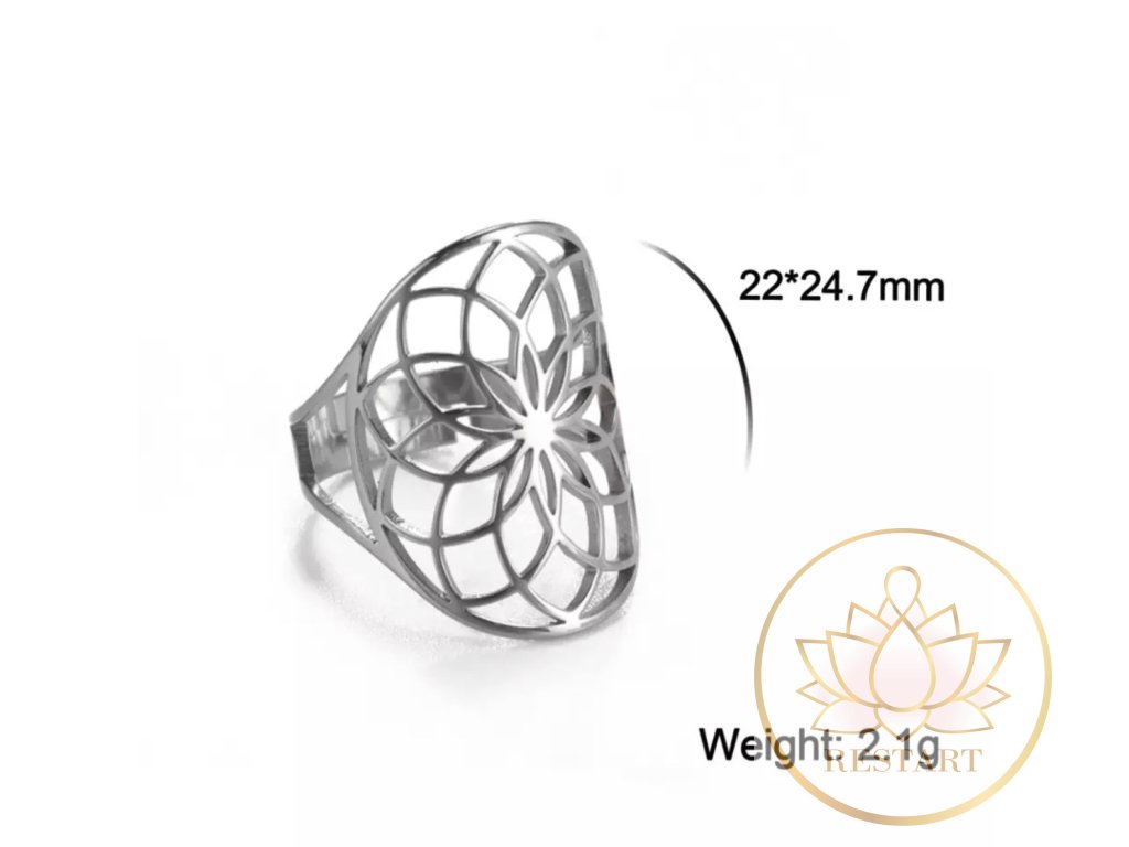 Prsten Květ života ve stříbrné barvě nerezová ocel, nastavitelná velikost