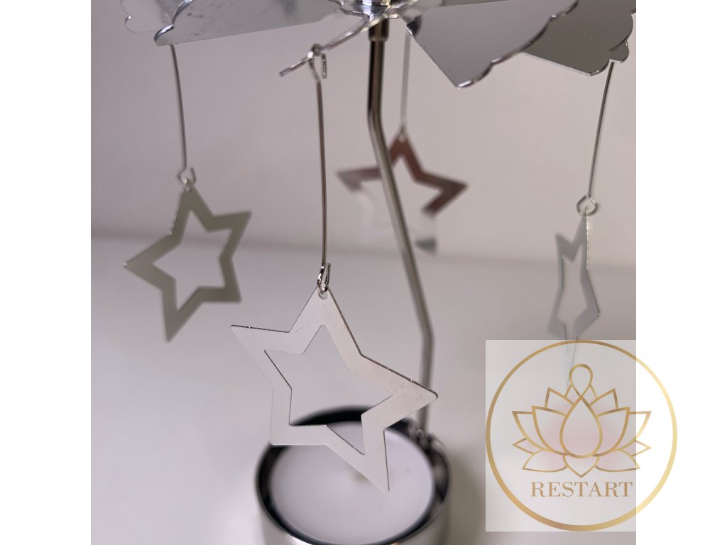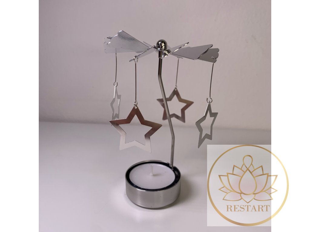 Kouzelný kovový svícen, jehož zavěšené motivy se jemně otáčejí díky teplému vzduchu z hořící svíčky. Vytváří nádhernou hru světla a stínů, která zútulní každý prostor a vnese do něj klidnou, pohádkovou atmosféru.