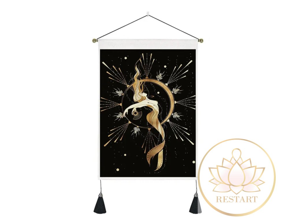 Nádherná tkaná dekorační tapisérie v tmavé barvě s motivem Bohyně Slunce ozdobí jak váš domov tak i meditační koutek.