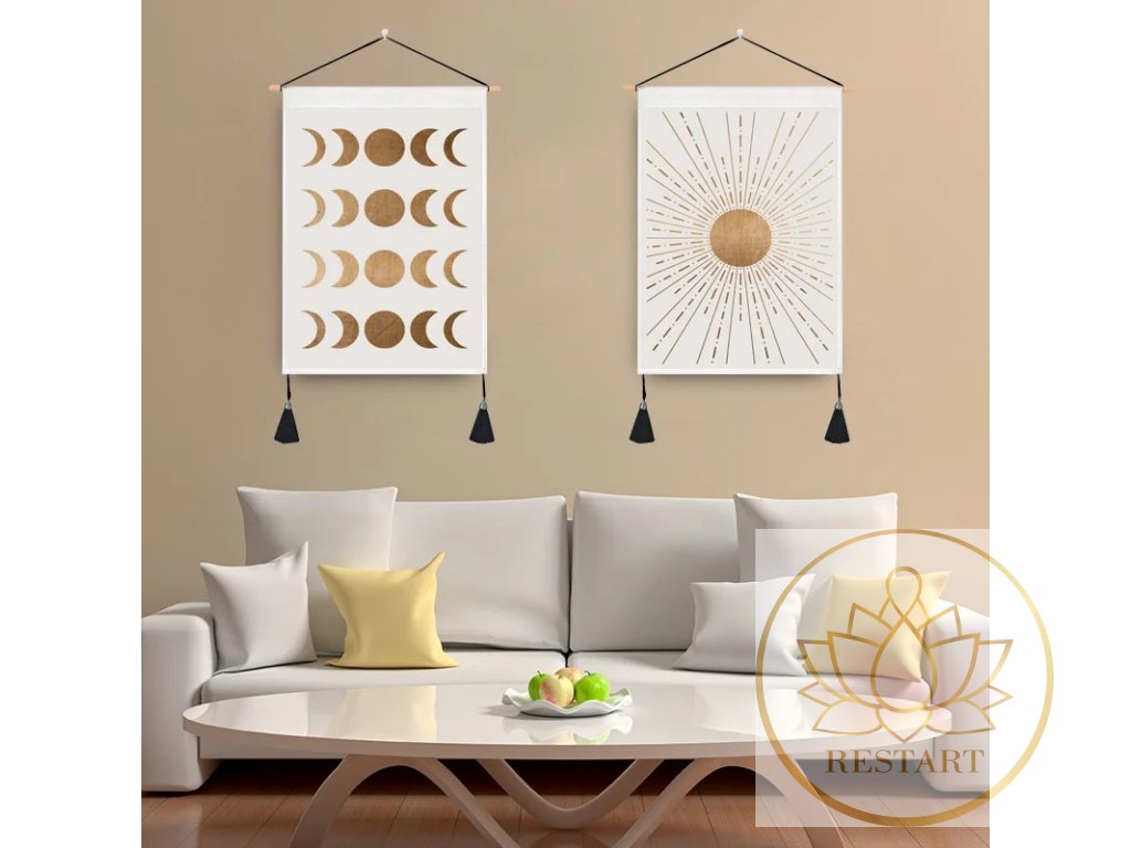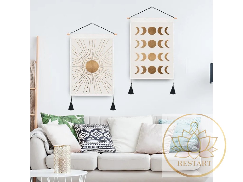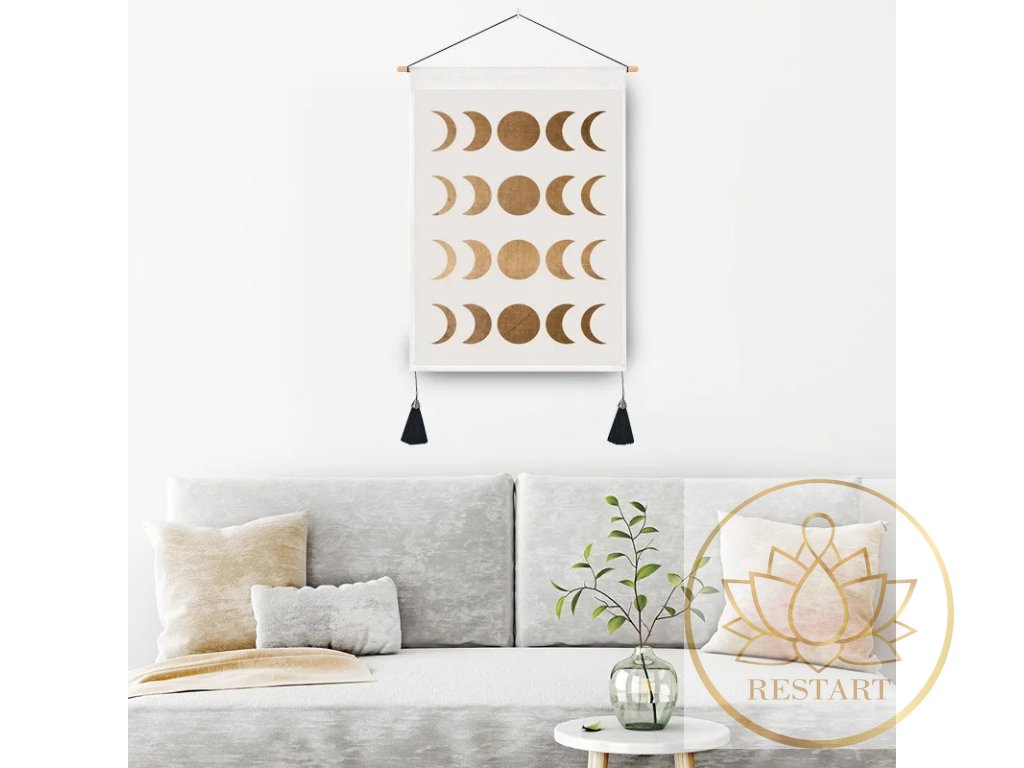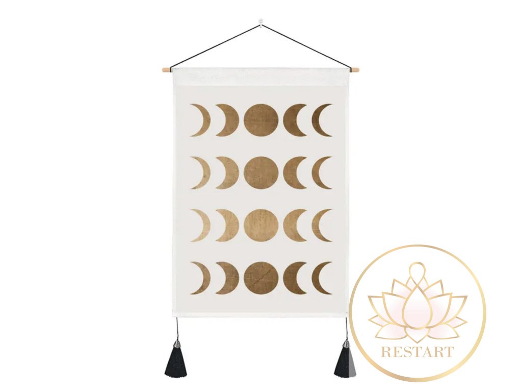 Nádherná tkaná dekorační tapisérie s jemným motivem zlatých fází Měsíce ozdobí jak váš domov tak i meditační koutek.