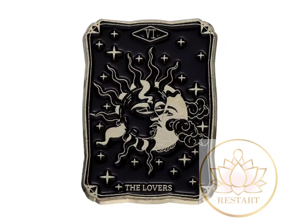 Jemně zpracovaný odznáček inspirovaný tarotovou kartou The Lovers ti připomene sílu lásky, souladu a hlubokého spojení – nejen s druhým člověkem, ale i se sebou samým a svým vyšším já. Symbolizuje volbu ze srdce, harmonii mezi ženským a mužským principem a cestu, kde nás vede láska, pravda a důvěra.