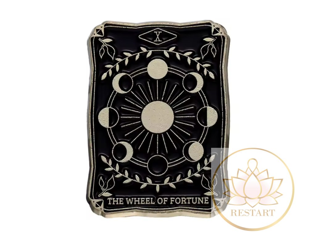 Symbol proměnlivosti života, osudu a neviditelného řádu – odznáček The Wheel of Fortune připomíná, že vše je v neustálém pohybu. Karta Kola štěstí je o změně cyklů, štěstí, synchronicitě a víře, že i v nejistotě jsme vedeni vyšší silou. Někdy jsme nahoře, jindy dole – ale každé otočení kola má svůj smysl.